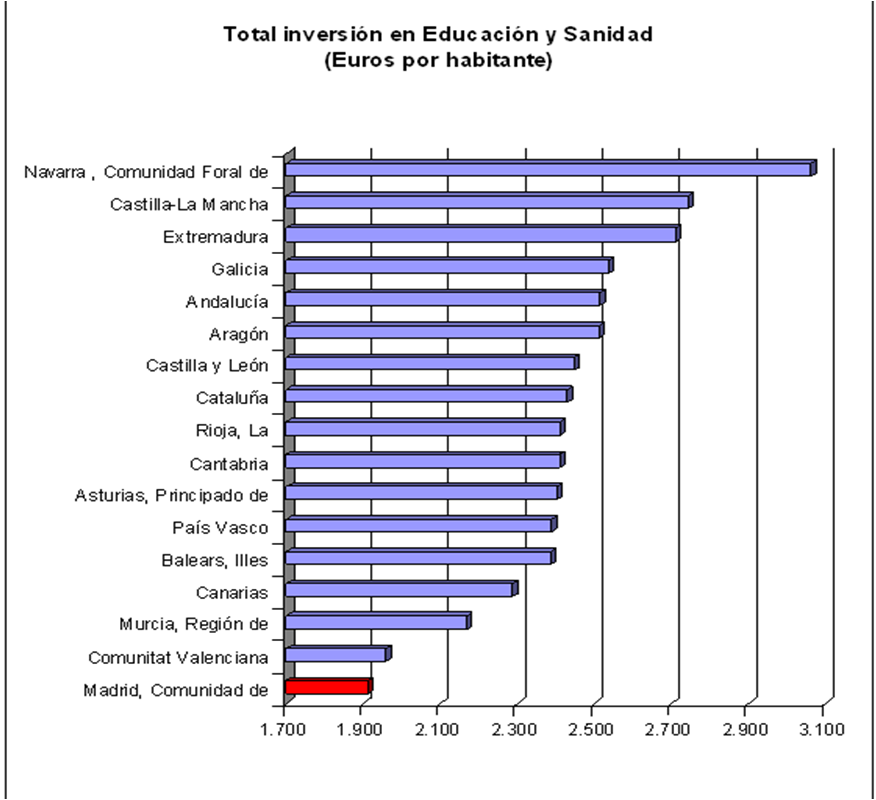 LA COMUNIDAD DE MADRID ES LA QUE MENOS INVIERTE EN SANIDAD Y EN EDUCACION POR HABITANTE JUNTO CON LA COMUNIDAD VALENCIANA, PROTOTIPOS DEL MODELO DEL PP. (Datos del informe realizado por la Fundación BBVA, cero sospechosa de bolcheviquismo).