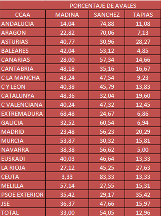 Ahora hay una polémica sobre la procedencia territorial de los avales que ha pedido Eduardo Madina que se haga pública y hay quien ve en esta petición una pataleta de mal perdedor. Yo tengo clara la procedencia porque mi último día de trabajo en Ferraz me lo pasé imprimiendo avales para que la máquina los leyera y entiendo que conocer la distribución territorial del apoyo a cada candidato es más que relevante. ¿Por qué? Porque después de la votación por toda la militancia del Secretario General del día 13 de julio habrá un Congreso clásico, con delegados elegidos por congresillos en sus respectivos territorios, en el que se votará su ejecutiva y si la fórmula de elección directa del Secretario General por todos los militantes se hace definitiva. No es baladí.