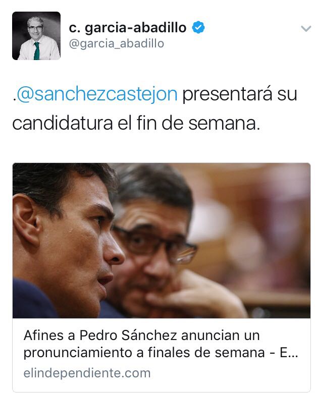 Ahora parece que también presentará su candidatura Pedro Sánchez. Es lógico, si obtener, en diciembre de 2015, tan solo 90 diputados fue algo histórico, para él y repetir el peor resultado desde el advenimiento de la democracia del PSOE, en junio de 2016, con 85, no le hizo plantearse dimitir, sino que se sintió con renovadas fuerzas de ser la única voz del PSOE, no veo por qué no va a volver a intentarlo ahora, todo es susceptible de empeorar.